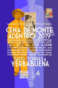 La Casa de la Herencia Cultural Puertorriqueña invites you to its annual community “Cena de Monte Adentro” event, scheduled for Saturday, October 26, 2019, from 6:00 pm to 10:00 pm, at El Barrio’s Artspace PS109. Our featured musical group will be Tato Torres and YERBABUENA!