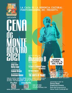 We are very grateful to our sponsors: Ponce Bank, Empirical Greens/Ron del Azucarero, NY Central Air and El Barrio’s Artspace PS 109.  Additional sponsorship information is forthcoming. Cena de Monte Adentro is open to the general public and is wheelchair accessible.